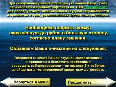 • Самый распространенный способ это пополнение через банкоматы банка. В меню банкомата нужно найти раздел погашения, выбрать счёт и внести деньги.