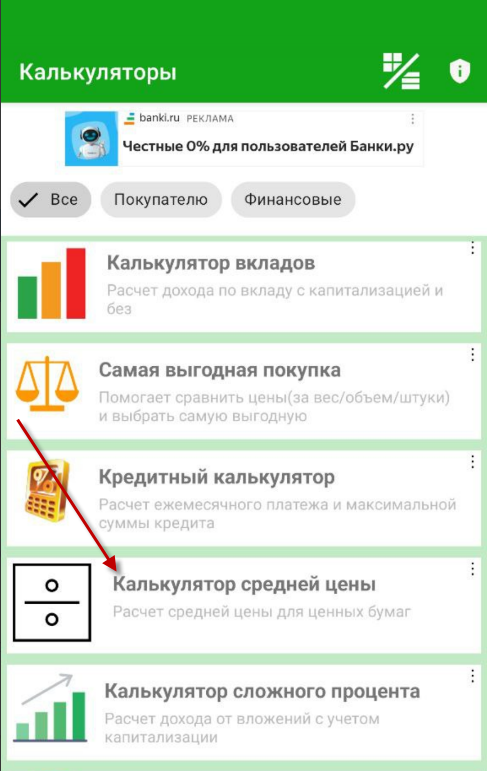 Если вы скачаете и установите приложение, то после запуска вам нужно нажать на «Калькулятор средней цены».